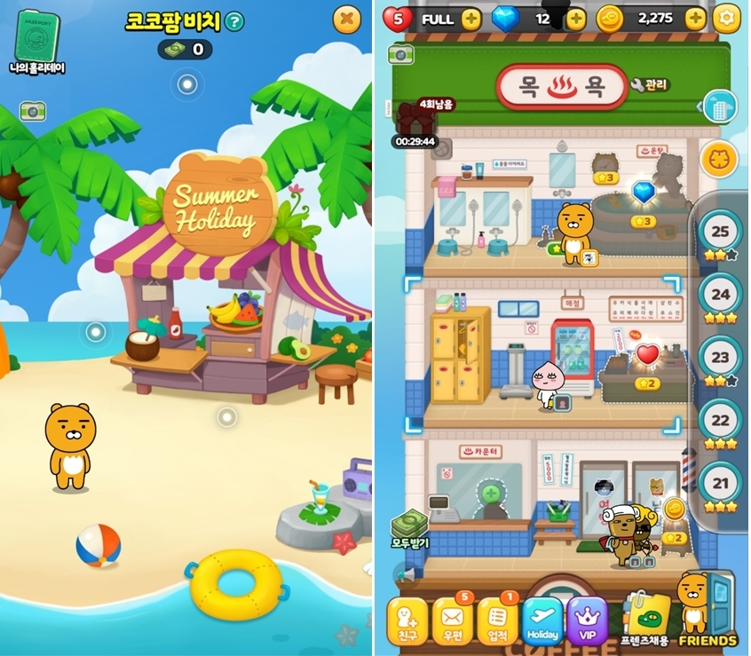 내 건물에 돌아다니는 손님, 고용된 아르바이트 직원 등은 모두 카카오프렌즈 캐릭터들이다. 그리고 퍼즐을 풀며 스테이지를 진행하는 와중에 모이는 포인트로 휴양지를 꾸미고 여기서 노니는 카카오프렌즈 캐릭터들을 보는 부가적인 요소도 갖추고 있다.