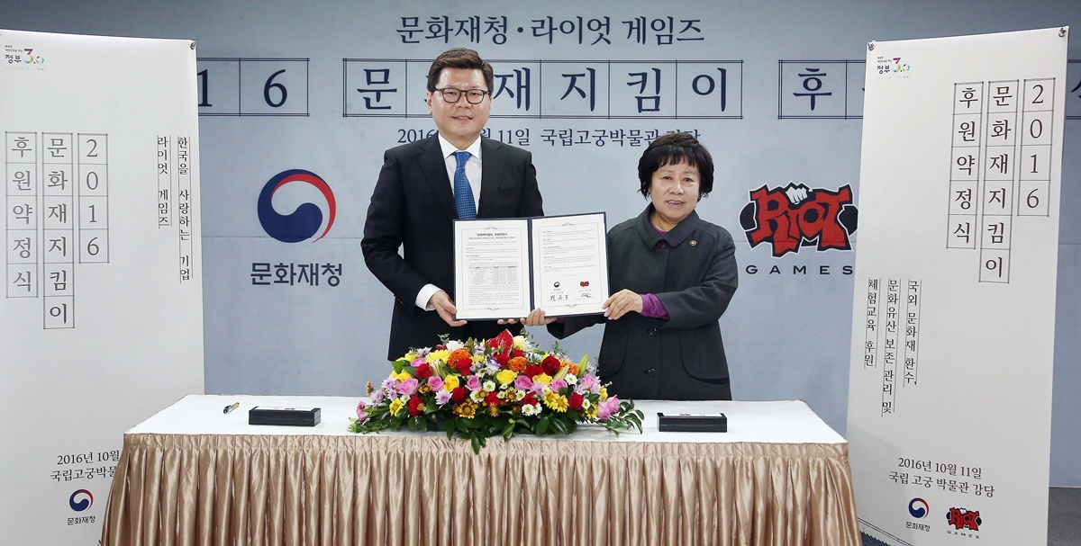 온라인 게임 리그 오브 레전드(이하 LoL)의 개발 및 유통사인 라이엇 게임즈(한국대표 이승현)가 금일 오전, 서울시 종로구 세종로에 위치한 국립고궁박물관 대강당에서 문화재청(청장 나선화)과 함께 '후원 약정식'을 진행했다고 11일 밝혔다.