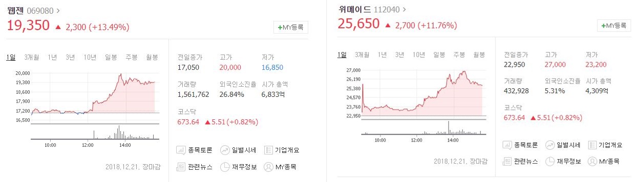 이에 중국 시장 사업을 전개하는 게임사를 포함한 국내 게임사들의 주가가 급등했다. 상승한 게임주들 사이에서도 특히 웹젠과 위메이드의 주가가 눈에 띈다. 웹젠은 13.49%, 위메이드는 11.76%가 상승해 각각 19,350원과 25,650원으로 장을 마감했다. 두 게임사 모두 뮤, 미르의전설 등 자사 IP로 오랜 기간 중국 시장 진출을 고대하고 있었다.