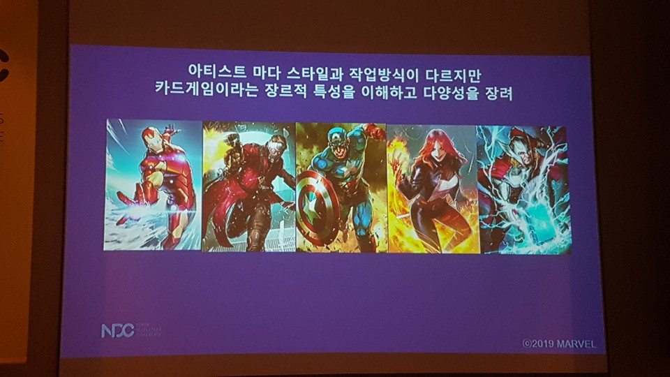 [게임플] 지난해 10월 넥슨이 출시한 마블 배틀라인은 TCG(트레이딩 카드게임)인 만큼, 여러 일러스트들이 부각되어 등장했다. 글로벌, 특히 북미를 타겟으로 한 게임이기에 아트 스타일도 중요했는데, 오늘(26일) 성남시 판교 소재의 넥슨 사옥에서 진행된 넥슨 개발자 컨퍼런스(NDC 2019)에서 그 후일담을 들을 수 있었다.