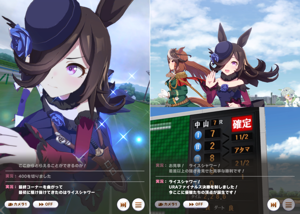 마지막으로, 게임 육성 시나리오에서 놓치지 말아야 할 부분이 있습니다. 생애 마지막이었던 타카라즈카 기념을 우승하고 나면, "달릴 수 있어서 좋았어"라며 울먹이는 라이스 샤워와 함께 "너는 우리 모두에게 푸른 장미야"라는 트레이너의 대사가 들어갑니다.