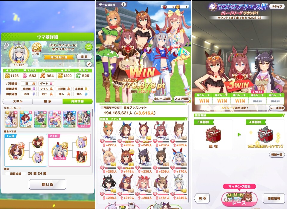 게임을 시작하면 유저는 자신이 보유한 우마무스메 중 하나를 골라 육성 모드에 들어간다. 마치 싱글 게임처럼 정해진 기간 동안 육성을 진행해 엔딩을 맞이한다. 그 엔딩 시점에서 완성된 우마무스메를 다른 레이스 콘텐츠에 출전시켜 활용이 가능해지는 것이다.