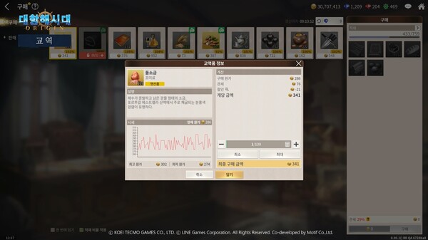 대항해시대 오리진에선 일정 주기로 교역품의 시세가 달라진다. 이에 시세 동향을 쉽게 파악할 수 있는 그래프를 제공해 교역품을 보다 저렴한 가격에 구매하고 비싸게 판매하는 재미를 높였다.