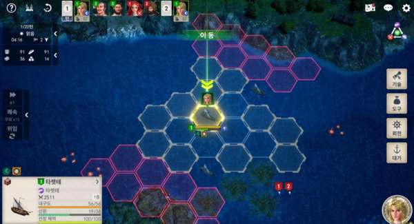 싸움의 무대인 타일 역시 승리를 위해 고민해야 할 요소다. 전투는 6각형 타일 위에 배치된 선박을 턴에 따라 조작하는 형태로 진행된다. 선박의 속도에 따라 턴 순서가 결정되며, 자신의 차례가 돌아오면 이동 이후 상대를 공격하거나 스킬을 사용할 수 있다.