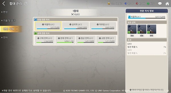 두 번째는 스킬과 전문지식이다. 몇몇 항해사의 경우에는 등급이 낮더라도 플레이를 직접적으로 돕는 스킬을 갖추고 있다. 또한 용도에 따라 나뉜 함선 내부 선실에 적합한 항해사를 배치할 경우, 일종의 스탯인 전문지식이 함대 전체의 전문지식으로 더해져 다방면에서 높은 성과를 거둘 수 있다. 선실과 항해사를 배치할 때 서로의 성상이 맞지 않는다면 전문지식이 50% 감소하므로 둘 사이의 관계를 미리 파악해야할 필요가 있다.