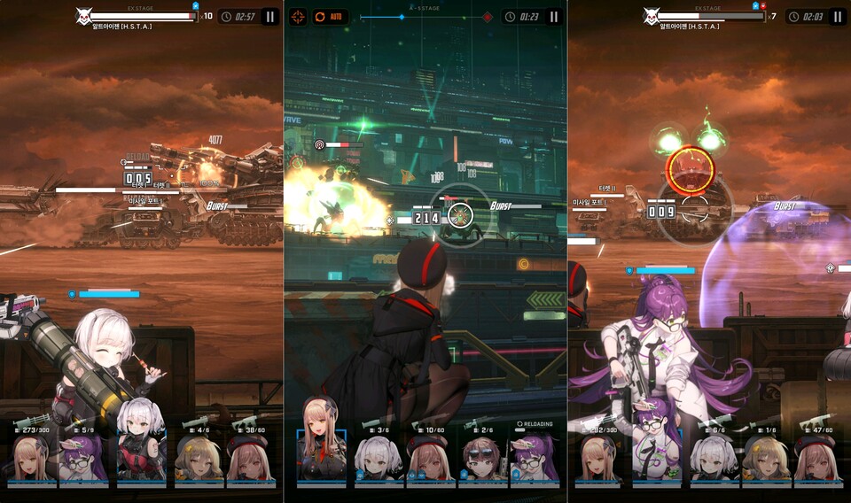 세로 화면 기반의 건슈팅은 모바일 화면에 최적화된 형태다. 유저는 한 손만을 사용해 니케 요원들의 엄폐와 사격을 반복할 수 있고, 간편한 드래그만으로 에임을 맞춰 적을 사격하는 플레이가 가능하다. 이 조작에서 느껴지는 손맛은 테스트 과정에서도 가장 호평을 받은 부분 중 하나다.