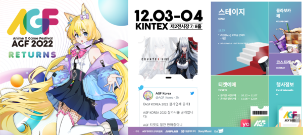 가장 먼저 열릴 행사는 '애니메 X 게임 페스티벌(이하 AGF) 2022'다. 행사는 12월 3일부터 이틀간 일산 킨텍스 제2전시장 7&8홀에서 진행된다. 애니메이션과 게임을 메인으로 전시, 팝업 스토어, 아티스트의 무대행사, 컬래버 카페, 코스프레 등의 현장 이벤트를 담을 예정이다.