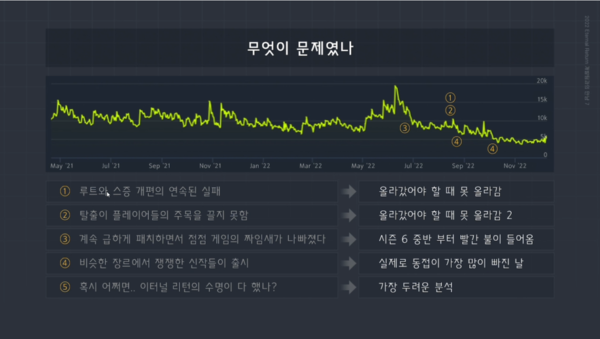 한 때 이터널 리턴은 동시접속자 5만 명을 넘어섰지만, 지금은 4천 명대로 박스권을 유지하고 있다. 개발진은 PvP 장르 게임으로 상당한 의미를 거둘 수 있는, 2만 명대까지 유저를 끌어올리려 했다. 하지만 최근 시즌7 업데이트의 아쉬운 성과로 기존 유저들까지 놓쳐버렸고 위기를 맞은 상황이라 설명했다.