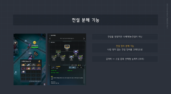 상대를 제압했을 때, 내 캐릭터에 맞지 않는 전설 장비를 분해해서 크레딧을 획득할 수 있는 시스템도 도입한다. 이제 유저들은 전설 장비를 분해해서 전송 콘솔로 오브젝트 아이템을 제작하는 선택지를 고를 수 있다. 단, 밸런스를 위해 오브젝트 아이템의 비용은 다소 높아질 예정이다.