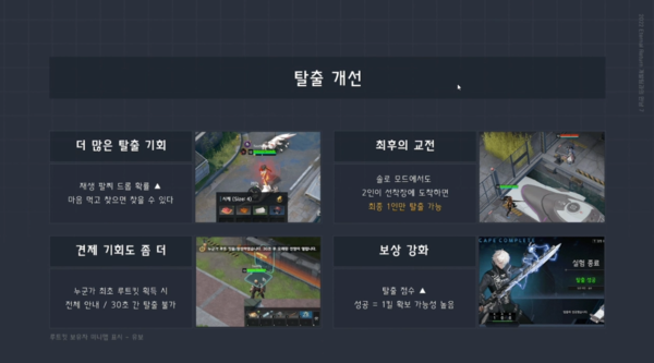 시즌7의 핵심 키워드였던 ‘탈출’은 확실한 엔드 플랜으로서 존재감을 발휘하도록 바뀐다. 유저가 루트킷을 제작하면 30초간 탈출이 막히고 맵 전체에 소식도 전파된다. 유저는 30초간 하이퍼루프 견제와 함께 탈출구에서 최소 한 번의 전투를 거쳐야한다. 탈출에 성공한다면 최소 1킬 성과는 가져갈 수 있게 된 것.