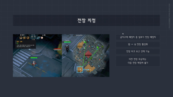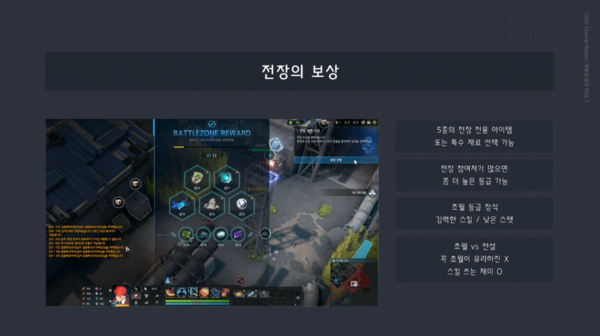 이리1 디렉터는 “전장은 스스로 전장의 타입을 선택할 수 있게하고 부활 기능까지 지원해줌으로써 초보자도 부담 없이 전투 경험을 쌓을 수 있는 공간으로 만들고 싶었다”라며 “전장을 통해 전투 경험을 쌓고 게임이 너무 허망하게 느껴지지 않도록 만들고자 한다”라고 밝혔다.