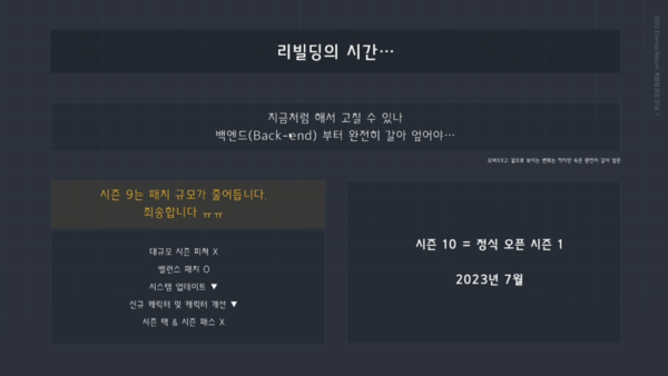 시즌8 신규 콘텐츠 소개 이후에는 정식 출시 전까지 운영 방향성에 대해 설명하는 시간을 가졌다. 시즌 10은 2023년 7월 정식 출시와 함께 시작되며, 시즌9는 출시에 앞서 ‘리빌딩’이란 표어 아래 완성도를 점검하는 시기가 될 예정이다.