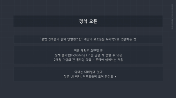 이리1 디렉터는 “과도한 추가 요소들로 게임이 불법 건축물같다는 피드백을 받았었다”라며 “새로운 요소가 생각나면 추가하고 문제가 발생하면 고치는 방식으로 운영하다보니, 게임의 모든 시스템이 체계적으로 조율되지 않은 상황이다”라고 밝혔다.