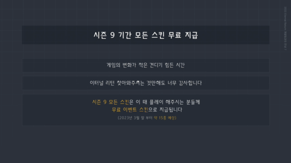 이리1 디렉터는 “시즌9는 게임의 변화가 적은 기간이기에, 견디기 무척 힘든 시간이 될 것 같다”라며 “하지만 힘든 시기에 게임을 플레이하는 유저들에게 감사의 마음을 표현하고 개발진의 비장한 각오를 보여드리고자 시즌9에 출시될 모든 스킨을 무료로 지급하겠다”라고 밝혔다.
