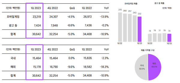 모바일 게임은 전분기 대비 약 4.5% 감소, 전년 동기 대비 약 14% 감소한 약 232억 원의 매출을 기록했다. 국내 매출은 전분기 대비 매출 수준을 유지, 전년 동기 대비 약 2.3% 감소한 약 1억 5천만원을 달성했다.