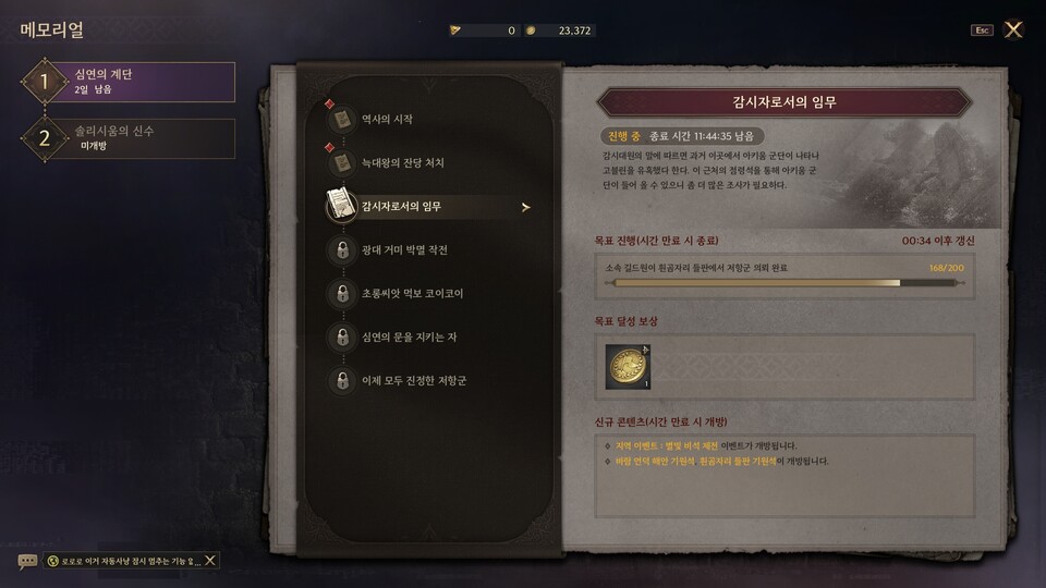 월드 변화를 이끌어내는 핵심은 '메모리얼' 시스템이다. 서버의 모든 유저가 함께 수행하는 월드 퀘스트 규모 콘텐츠를 말한다. 일정 시간 동안 서버 단위로 수행해야 할 미션이 제시되고, 모든 유저가 수행한 기록을 합쳐 목표 달성 여부를 체크한다.