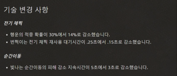 또한 번쩍이는 전기 채찍 재사용 대기시간 감소 보너스가 0.25초에서 0.15초로 감소하며 방어 기술과 궁극기 불안정한 전류를 꾸준히 사용하기 어려웠다. 또한 필수 핵심 고유 아이템 획득이 늦어져 높은 피해량을 보기 어려웠다.