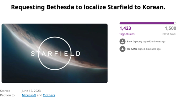 결국 이번에도 유저들이 나섰다. 한국어 지원 소식이 없자 유저들은 미국의 서명운동 사이트인 change.org에 스타필드 한국어화 지원을 요구하는 청원을 올렸고, 해당 청원은 1,400개가 넘는 서명을 받았다. 여기에 유저 자체 현지화 작업 인원을 모집하는 번역팀도 등장했다.