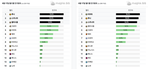메이플스토리 종합 통계 사이트에 따르면, 18일 기준 총 109,429명의 캐릭터가 이번 월드 리프 이벤트에 참여했다. 이번 이벤트의 최대 수혜 월드는 크로아다. 220레벨 이상 캐릭터 43,148명이 크로아로 이주했다. 총 40,730명이 이주한 엘리시움이 뒤를 이었다. 두 월드 모두 메이플의 대표적인 도시 월드로 이번 이벤트를 통해 10% 가까이 인구수가 늘었다.