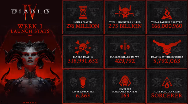 디아블로4는 출시 첫 주 유저 플레이 타임 2억 7천 시간을 넘겼다. 가장 최근 개발자 간담회에서 디아블로 총괄 매니저 로드 퍼거슨은 3억 5천 시간을 넘겼다고 밝혔다.