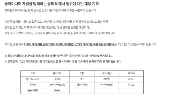 지난 25일 메이플스토리 공식 홈페이지에 공지사항이 올라왔다. 당시 주말 오후였던 점을 고려하면, 이례적인 상황이다. 그동안 게임 내에서 다른 유저를 쫓아다니며 게임을 방해하는 행위에 적극적인 대응을 하지 못했던 부분을 사과하며, 향후 이러한 문제에 대해 적극적으로 조치하겠다는 내용이었다.