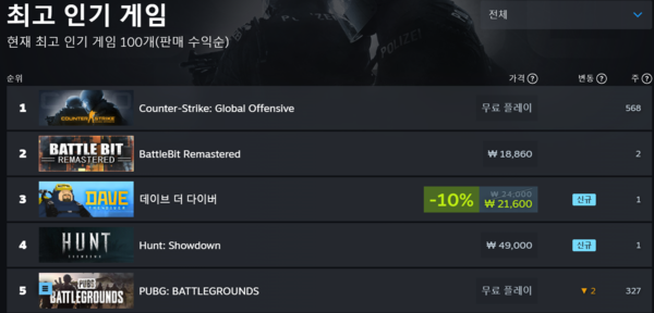 이번 정식 출시와 함께 ‘데이브’는 단박에 글로벌 3위까지 올랐다. 경쟁하는 게임들 역시 쟁쟁하다. 정통의 'CS:GO'와 서구권 돌풍의 게임 '배틀비트:리마스터'가 1위와 2위 자리를 잡고 있다.