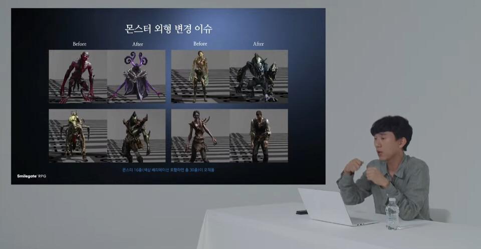 몬스터 외형 변경 이슈는 패치노트 제작 과정을 말하면서 설명했다. 대규모 개발진이기 때문에 팀마다 각자 작업을 검수해 노트에 합치는데, 빌드 검수 과정이 미흡해 체크 과정에서 16개 몬스터가 잘못 딸려들어왔다는 것이다.
