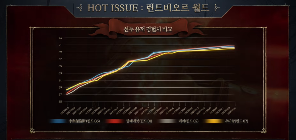 최상위 레벨업에 가장 유리한 것으로 알려진 마법사 클래스가 아니라는 점도 감탄을 자아내고 있으며, 2위와 3위 자리도 뒤바뀌면서 레벨 경쟁이 지속되고 있다.