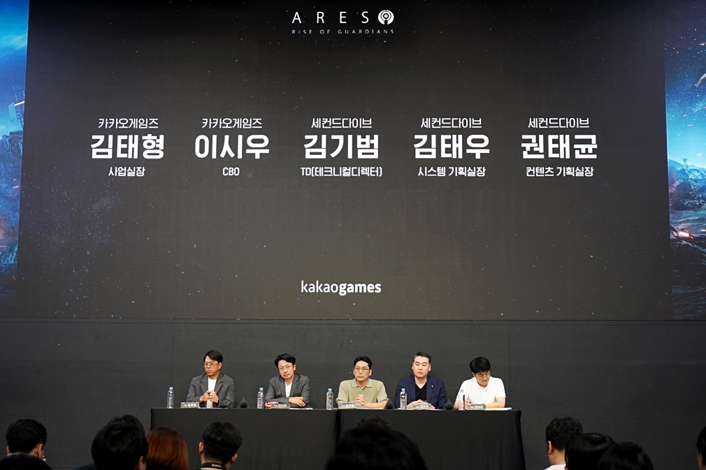 아레스의 개발 과정과 향후 방향에 대한 자세한 이야기를 들을 수 있었던 개발자 인터뷰가 10일 진행됐다. 이번 인터뷰엔 카카오게임즈의 이시우 CBO, 김태형 사업실장과 함께 세컨드다이브의 김기범 TD(Technical Director), 김태우 시스템 기획실장, 권태균 콘텐츠 기획실장이 함께했다.