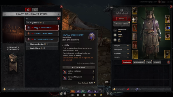 포악한(Brutal), 잔혹한(Vicious), 교활한(Devious)으로 구분되는 3종류의 심장을 제작할 수 있으며 제작하려는 심장과 다른 종류의 ‘악성 영액(Malignant Ichor)’을 재료로 소모한다. 제작된 갇힌 심장은 캐릭터 레벨에 따라 아이템 위력과 어픽스가 무작위로 정해진다.