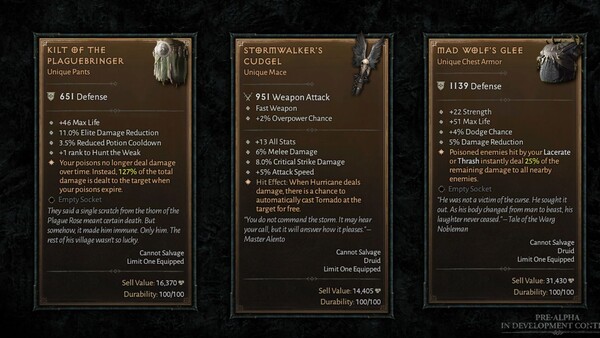 고유 아이템의 위력이 전설 위상보다 상대적으로 약한 것에 대해서는 반드시 고유 아이템이 우월한 수준의 장비가 되는 것은 아니라고 밝혔다. 특정 빌드와 함께 사용되며 빌드를 독특하게 만들기 위한 장치로 봐야 한다고 언급했다.
