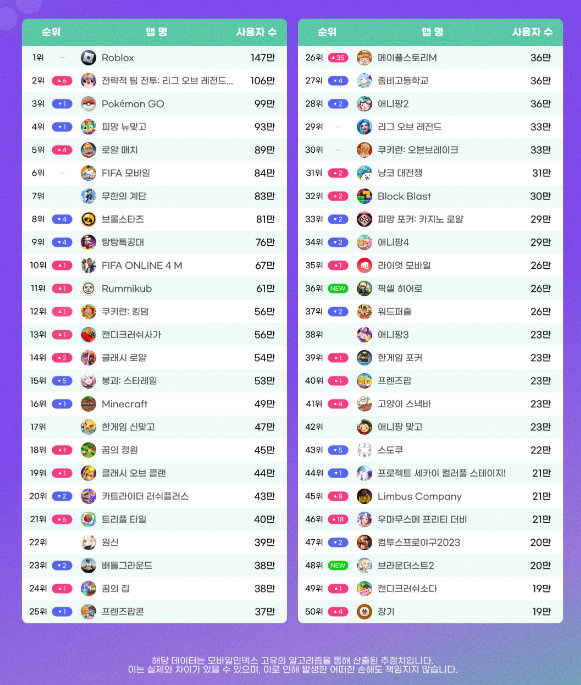 최고 유저 수 게임은 역시 '로블록스'다. 6월 월간이용자(MAU)에서도 부동의 국내 1위를 지키고 있다. 지난달에 비해 추정치가 13만 명 가량 줄었지만, 여전히 2위와 40만 명 차이를 벌리면서 압도적인 인기를 과시한다.