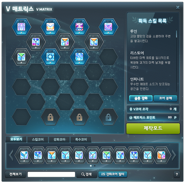 결국 메이플스토리의 매트릭스는 단순히 새로운 스킬과 스탯을 부여하는 성장 수단이 아니다. 필요한 코어를 제작하고 강화해서 슬롯에 장착하는 방식은 장비 시스템과 크게 다르지 않다.