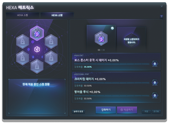 260레벨 이후 6차 전직 역시 크게 다르지 않다. ‘HEXA 매트릭스’는 ‘HEXA 스킬’과 ‘HEXA 스탯’으로 나눠진다. 눈에 띄는 부분은 유저가 원하는 대로 HEXA 스탯 코어를 제작할 수 있다는 점이다. 메인 스탯 1개와 부가 스탯 2개를 확률에 따른 강화를 통해 원하는 옵션을 만들 수 있다.
