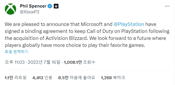 이후 마이크로소프트 게이밍 CEO 필 스펜서는 자신의 트위터를 통해 “MS와 플레이스테이션이 액티비전 블리자드 인수 이후에도 콜 오브 듀티를 계속 서비스하는 구속력 있는 계약을 체결했다”고 밝혔다. 이전 MS가 소니에게 제안했던 계약이 드디어 성사된 것이다.