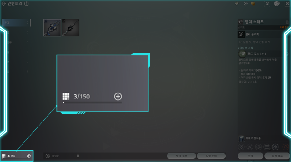 슬롯과 무게 중 부담스러운 개념은 단연 무게였다. 무작위로 무거운 무기를 얻게 되면 넉넉하던 인벤토리가 한 번에 차버리는 불편이 있었다. 특히 자동사냥으로 자리를 비웠을 때 이런 경우가 발생하면 억울한 손해를 보게 된다.