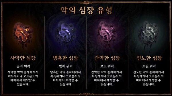 악의 심장은 사악한, 흉포한, 간악한, 진노한의 접사로 구분되며 각각 공격, 방어, 보조, 특수 능력을 갖추고 있다. 이번 시즌 총 32종의 심장은 12개의 공용 심장과 20개의 직업 전용 심장으로 구성된다.