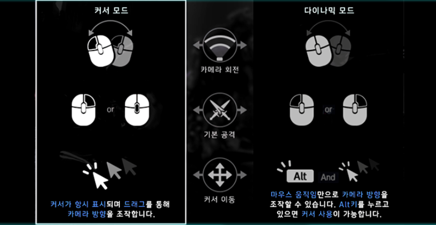 커서 모드는 일반적인 MMORPG와 같이 마우스 커서가 언제나 표시되며, 드래그로 카메라 방향을 바꾸고 목표 방향을 클릭으로 지정할 수 있다. 반면 다이나믹 모드는 PC-콘솔 액션 게임처럼 마우스 움직임만으로 카메라 방향을 바꾸고, 커서 사용이 필요할 때는 ALT 키를 눌러 보이게 한다.