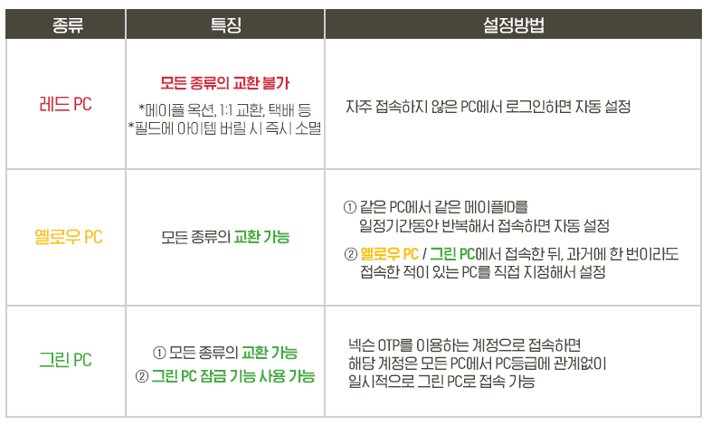 그린 PC와 옐로 PC에선 어떠한 제한 없이 정상적인 플레이가 가능하지만, 레드 PC에선 1:1 거래나 경매장 등 모든 종류의 아이템 교환이 제한된다. 등급을 올리기 위해서는 해당 PC에서 지속적으로 게임을 플레이하거나, 넥슨 OTP를 활용해야 한다.