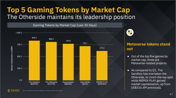 시가 총액 기준으로 상위 5개의 게임 토큰으로 The Sandbox, The Otherside, Decentraland, Axie Infinity, WEMIX PLAY 순으로 차지했다. WEMIX PLAY의 시가총액이 이전 분기 약 3억 달러에서 두 배인 약 6억 달러로 늘었다.