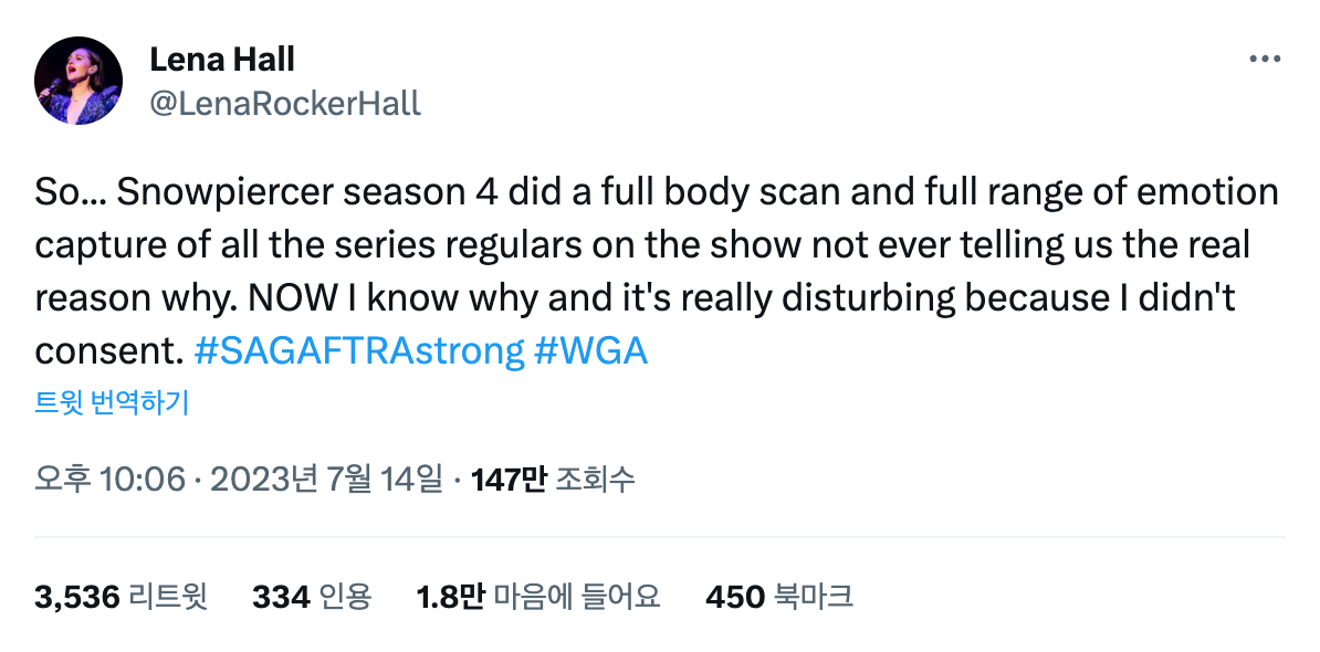 파업에 참여한 배우들 역시 생성형 AI 문제를 꼬집었다. 이들은 스크린 속 배우들의 노력이 담긴 장면 하나하나가 인류의 무궁한 영화 역사를 삼켜 몸을 불린 AI가 만들어 내는 ‘딥 페이크’로 얼마든 대체될 수 있음을 우려했다. 실제로 드라마 ‘설국열차’의 배우 리나 홀(Lena Hall)이 드라마의 제작진이 AI를 학습시킨다는 목적을 숨기고 배우들에게 연기를 요구했음을 폭로하면서 이들의 우려는 신빙성을 얻었다.
