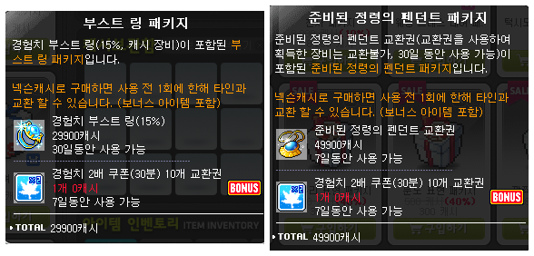 신규 캐시 아이템도 추가된다. 착용 시 10%의 추가 경험치를 지급하는 ‘혈맹의 반지’를 비롯한 경험치 추가 획득 아이템을 포함했던 실용팩 판매가 종료되고, 착용 시 각각 15%와 30%의 추가 경험치를 획득할 수 있는 ‘부스트링’과 ‘준비된 정령의 펜던트’ 패키지가 29,900원, 49,900원에 판매된다.
