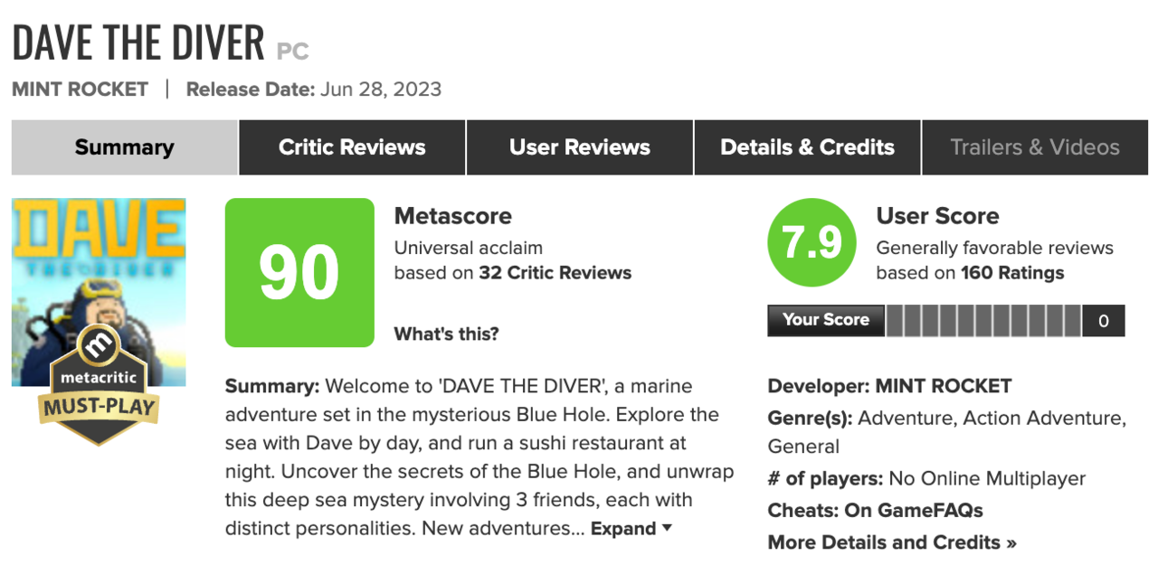 미국의 최대 규모 리뷰 집계 사이트 메타크리틱이 데이브를 ‘머스트 플레이(MUST-PLAY)’, 즉 반드시 해봐야 할 게임으로 선정했다.