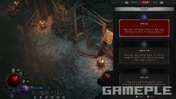 15레벨까지 세계 단계 1로 게임을 진행한다. 필드 이벤트와 필수 위상을 구하기 위해 던전을 클리어하는 것만으로 금방 도달한다. 15레벨이 되면 직업 퀘스트를 진행하고 ‘전문화’ 기능을 개방한다. 이때 얻은 ‘연계 점수’ 전문화는 악몽 난이도까지 사용된다. 20레벨에 얻는 ‘내면의 시야’를 사용하는 빌드도 있으나 초반 빠른 레벨링을 위해서 ‘연계 점수’를 권장한다.