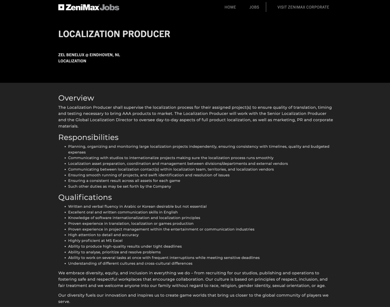 그러던 중, 베데스다의 모회사인 제니맥스가 공식 홈페이지를 통해 한국어와 아랍어 현지화 프로듀서를 구인한다고 밝혔다. 해당 공고에 따르면 이번에 채용될 현지화 프로듀서가 AAA급 패키지 게임을 출시하는 데 필요한 번역을 비롯해 마케팅, PR 등을 감독하는 업무를 맡는다.