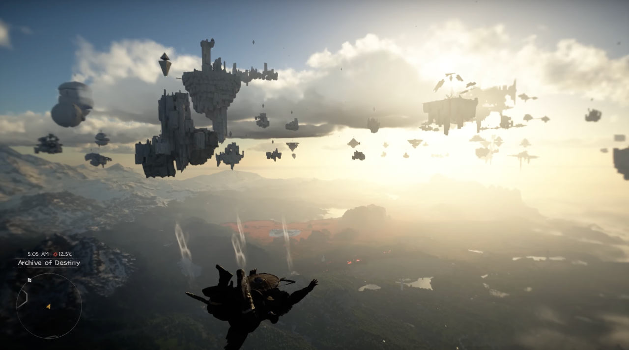 이뿐만이 아니다. 건물의 외벽을 타고 매달리는 자세는 ‘어쌔신 크리드’ 시리즈의 유구한 전통과 완벽히 일치하며, 한눈에 담기지 않을 정도로 우뚝 선 보스를 붙잡고 올라가 상대하는 모습은 ‘완다와 거상’에서 종일 봤던 그것이다. 또 망루 위에 올라 포효하는 용의 모습에선 ‘엘더스크롤: 스카이림’의 도입부 명장면이, 하늘 위를 장식한 부유하는 암석들 틈으로 떨어지는 모습과 ‘울트라 핸드’와 유사한 시스템에선 ‘젤다의 전설’ 시리즈가 떠올랐다.