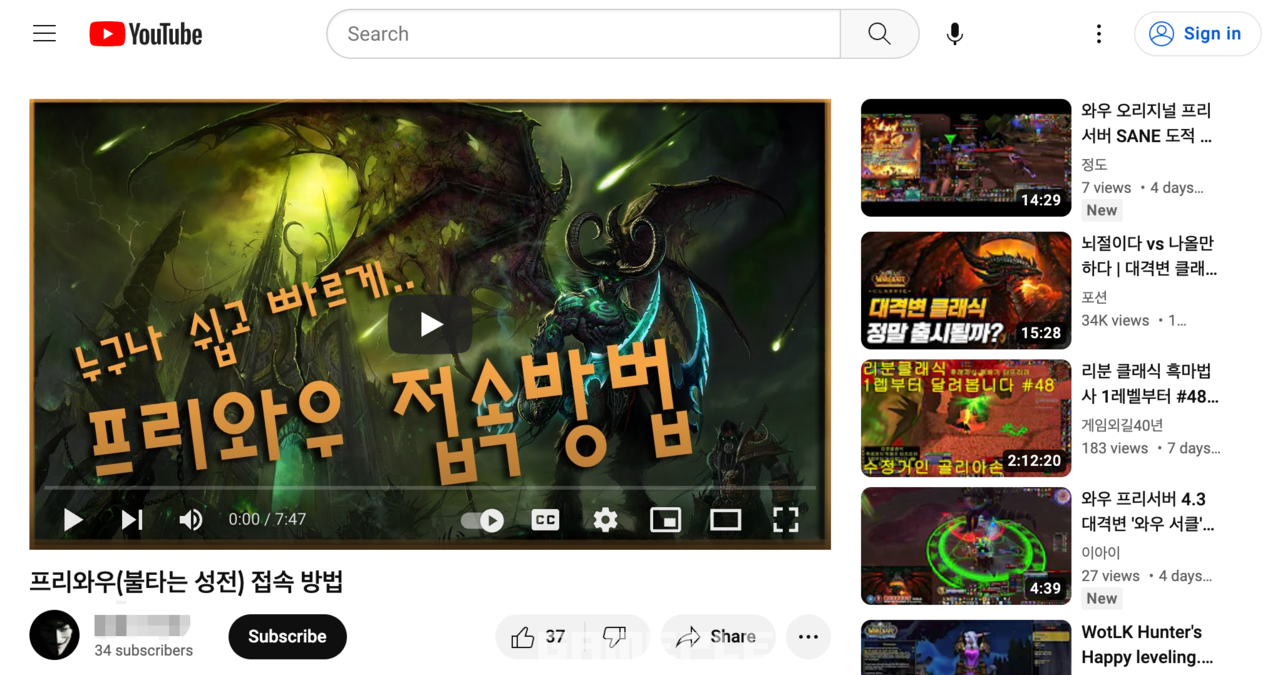 불현듯 호기심이 동해 유튜브에서 해당 서버를 찾아봤다. 놀랍게도 생각보다 쉽게 찾을 수 있었다. 불타는 성전 확장팩을 베이스로 한 사설서버는 유튜브를 통해 유저들에게 유포되고 있었다. 웹 드라이브를 통해 클라이언트를 공유하고, 간단한 방법을 거치면 “누구나 쉽고 빠르게” 사설서버에 접근할 수 있었다.