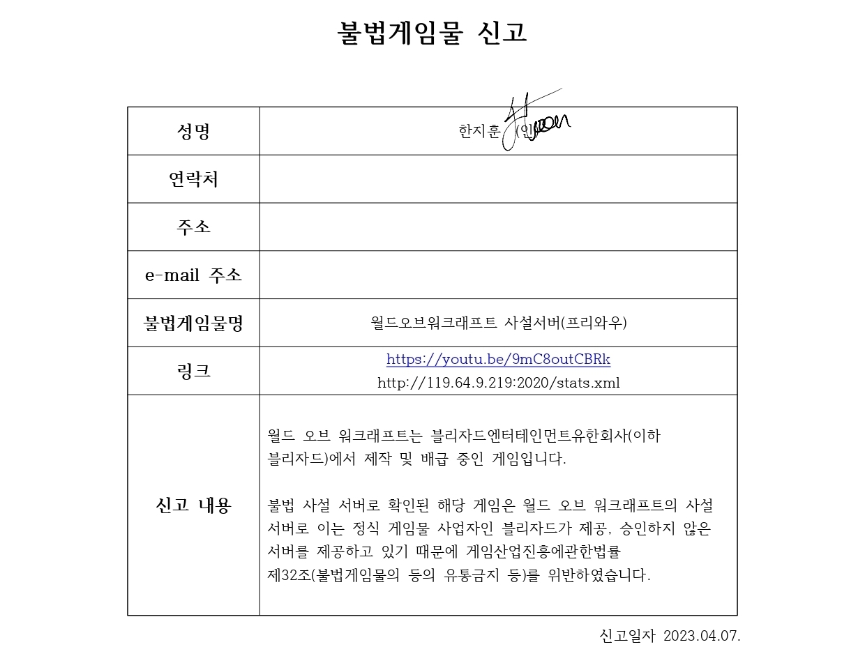 이를 발견한 이상, 이대로 방치할 수는 없다는 생각에 대책을 찾았다. 게임물관리위원회에 사설서버를 신고하면 포상금을 받을 수 있다는 것을 확인했다. 부끄럽지만 정의감보다 주린 배를 채우기 위한 포상금을 좇아 곧바로 신고 절차에 들어갔다.