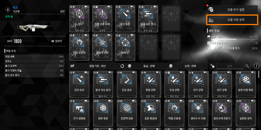 무기에 장착할 수 있는 모듈은 기본 6개에서 최대 10개까지 가능하다. 단 무기의 모듈 수용량과 모듈이 차지하는 모듈 수용량을 고려해야 한다. A 무기의 모듈 수용량이 20일 경우 5의 수용량을 차지하는 모듈 4개만 장착 가능한 것이다.