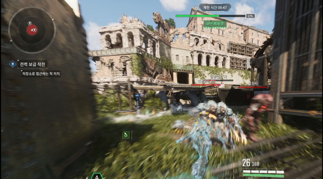 기자는 시연 후반부 ‘에이잭스’를 주로 플레이했다. 아군을 보호하기 위해 그래플링 훅으로 이동하고 방벽을 펼치는 과정이 상당히 매력적이었다. 그래플링 훅 - 공간도약 - 방벽으로 이어지는 액션은 마치 ‘슈퍼히어로 랜딩’을 연상시켰다.